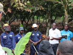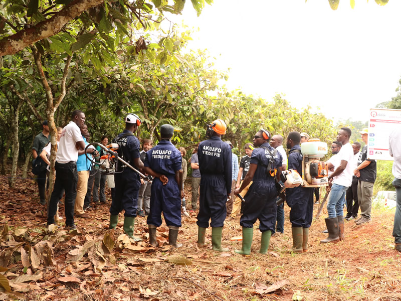 Field trip participants also visited one of Touton’s demonstration farms in Jubeso district and interacted with service providers. As part of the Project (and the RSC service delivery model), Touton and GIZ (German development agency) have trained 16 service providers in the Juabeso district who provide pruning, weeding, and spraying services using simple technologies from the GIZ. This provides employment opportunities for the youth in the landscape.